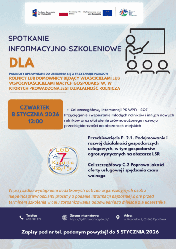 ❕Zapraszamy na spotkanie informacyjno-szkoleniowe przed naborem wniosków na rozwój istniejących gospodarstw agroturystycznych z obszaru Stowarzyszenia „LGD7 – Kraina Nocy i Dni”.